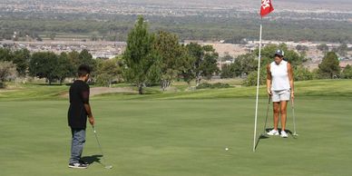 Susan Craig coaching a young golfer at the 2022 Kids First Golf Tournament